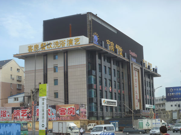 August 29, 2012, DXVISION TN-EP12.5 outdoor electronic pixel screen stands upright upon one hotel in Liaoning province. The resolution of the screen is 5952*768 pixels and the total size is 714.24 square meters. The high-definition picture quality and the true-color image make the hotel highlight upscale and dignity.