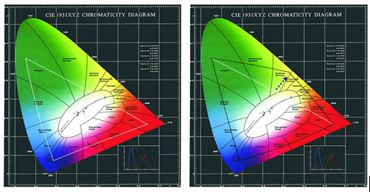 ▲如图,左图三基色系统为RGB三点所围面积,右图四基色系统所选四点为RGB+Y,则其所围面积明显大于三基色系统的面积。