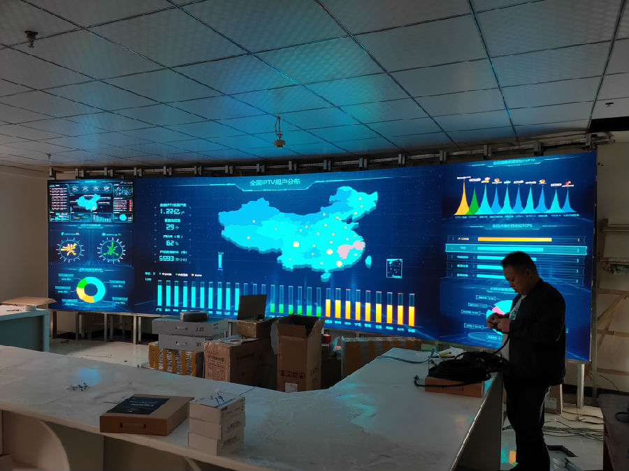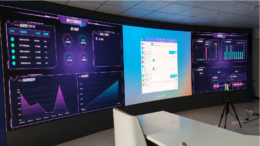 贵定县广播电视台融媒体四月份全面启动,融媒中心采用大象视界广电级LED屛P1.875系列,面积约14平方米,内弧定制,画面真实还原色彩,画面清晰不闪烁,视觉舒适,拍摄图像无摩尔纹和闪烁等现象,满足广播电视台背景大屏拍摄的特殊要求。