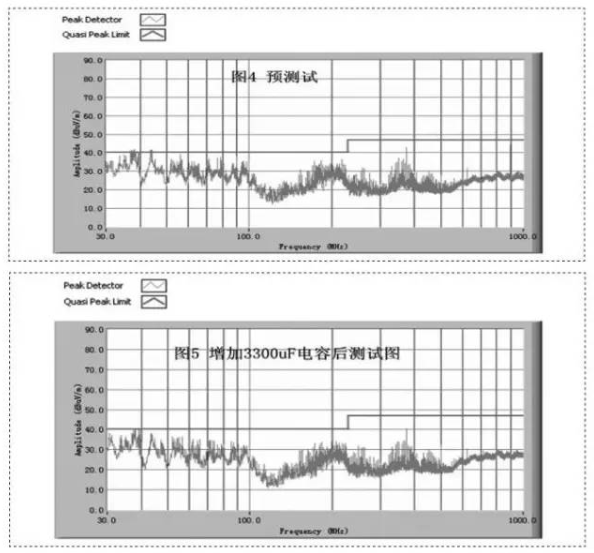 现场测试时,在模块电源VH2处增加一个3300uf的电解电容,发现对辐射的抑制作用明显,特别是在30MHz至1000MHz区间对毛刺和能量频谱的抑制作用明显。电容值越大,对毛刺尖峰的抑制作用越明显,滤波后的曲线越平滑。当然,电容值的选择需要按照实际的设计要求来定。