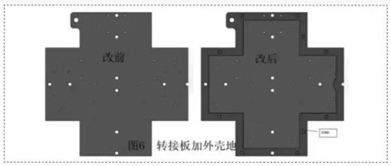 当LED面阵驱动板增加两层接地,由原先的4层板变成6层板,能起到较好防止辐射的作用。当转接板周边附整边铜箔,并与金属箱体用螺钉紧固,形成外壳地,从而达到对信号起到屏蔽作用。