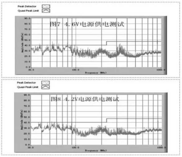 因为传导、辐射的数值与dv/dt 或者 di/dt成正比,所以电压越高,传导、辐射的数值越大。样品的供电电压是4.6V,当电压调整供为4.2V后,从实验数据可以看出,发现尖峰毛刺也能得到一定改善。