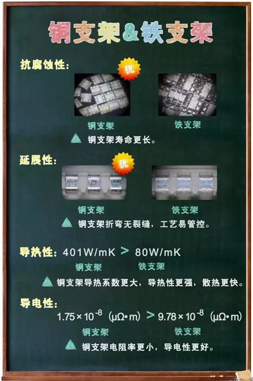 户外LED显示屏在使用过程中,常要面对雨天潮湿、晴天暴晒等恶劣环境,这就要求器件必须具备良好的性能,才能够抵挡外界对其的损耗。抗腐蚀性强,导电性、导热性好能令器件具有寿命更长、散热更好、光衰更小的优势。而通过对比试验我们可以得出,铜支架的各项性能远优于铁支架。 但是,铜支架的价格却是铁支架的10倍,甚至以上。为此,很多厂家不顾器件质量,只追求低成本,高回报,选择铁支架作为原材料,所以市面上才会出现如此多的“低价器件”。