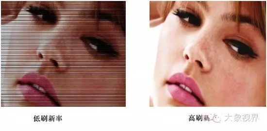 当人眼直接观看显示屏时,感觉画面有闪烁现象,用相机或摄像机拍摄时出现很多横向暗线时,说明此屏的刷新率较低。在不影响人眼直接观看的条件下,显示屏的刷新率不能低于300Hz,而要满足相机及摄像机等摄像设备要求时,显示屏的刷新率需达到2000Hz以上,下图为高低刷新率下的效果对比:
