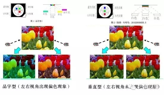 在视角范围内在能清晰完整地观看到图像的基础上,不同视角不能出现偏色的现象,这主要跟LED灯仔的RGB晶片封装排列方式有关,目前市面有品字型和垂直型两种排列方式,其效果对比如下图所示: