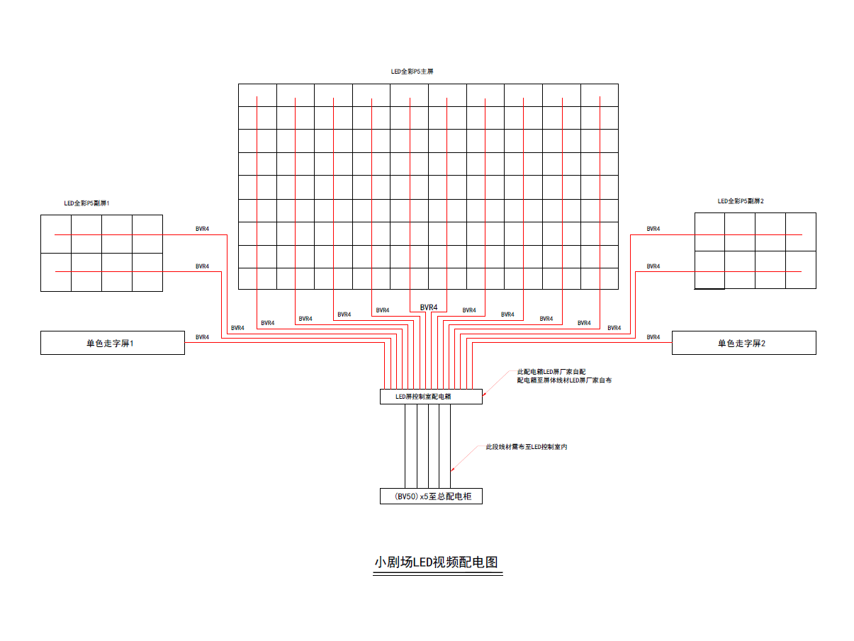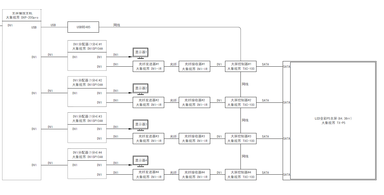 LED全彩屏幕系统包括LED屏幕和大屏控制系统;播控系统包括播放机、大屏控制软件、4K视频采集卡、HDMI高清矩阵、机顶盒(DVD)等组成。