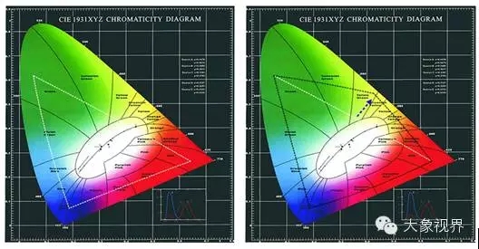 如下图所示,左图三基色系统为RGB三点所围面积,右图四基色系统所选四点为RGB+Y,则其所围面积明显大于三基色系统的面积。因而,四基色可比三基色显示更多的自然色彩,更符合“亲临其境”的要求。
